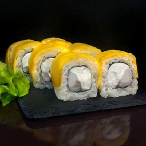 Рис, нори, сыр творожный, салат, курочка копчёная, сыр чеддер, соус терияки.