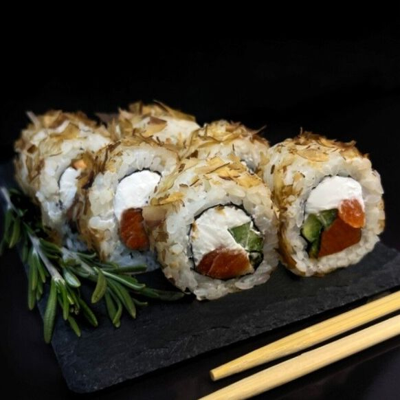 Заказать Рис, нори, сыр творожный, огурец, лосось, стружка тунца.