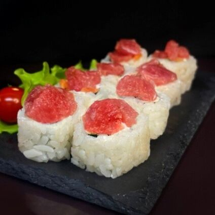 Рис, нори, сыр творожный, креветка, краб микс, икра масаго черная.