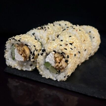 Заказать Рис, нори, сыр творожный, лосось терияки, огурец, кунжут цветной.