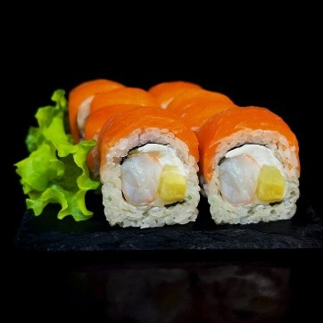 Рис, нори, сыр творожный, ананас, креветка, лосось.
