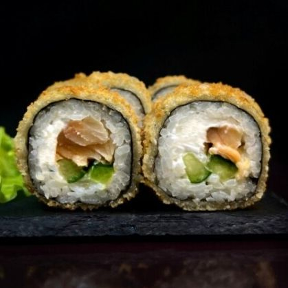 Заказать Рис, нори, сыр творожный, угорь, икра масаго, огурец, темпура, соус терияки.