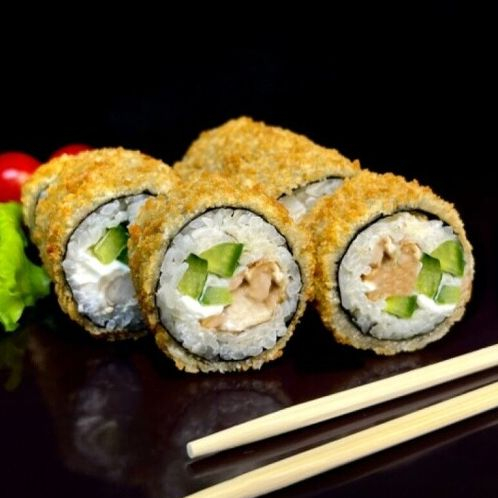 Заказать Рис, нори, сыр творожный, курица копчёная, салат, темпура, соус терияки.