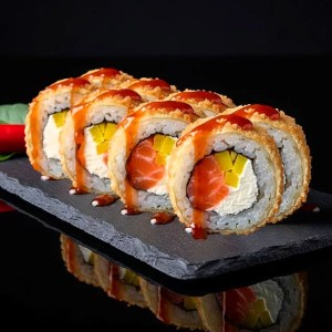 Рис, нори, сыр творожный, лосось, такуан, темпура, соус свит чили.
