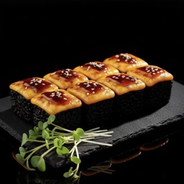 Заказать Рис, нори, сыр творожный, салат, мидия, сырная шапочка, соус терияки, кунжут.