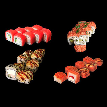 Shrimp-roll, Нежный лосось, Суши с лососем, Нигири с креветкой, Нигири с тунцом, Нигири с угрем, Суши с икрой, Америка, Тункай, Темпура креветка, Домбай.