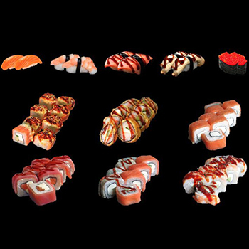 Калифорния с крабом, Запеченный лосось, Домбай, Темпура микс, Темпура с креветкой, Радуга.
