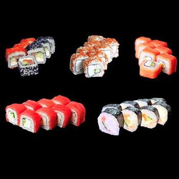 Shrimp-roll, Нежный лосось, Суши с лососем, Нигири с креветкой, Нигири с тунцом, Нигири с угрем, Суши с икрой, Америка, Тункай, Темпура креветка, Домбай.