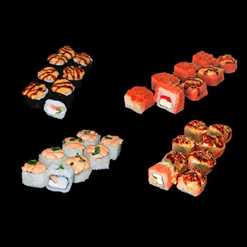 Калифорния с крабом, Запеченный лосось, Домбай, Темпура микс, Темпура с креветкой, Радуга.