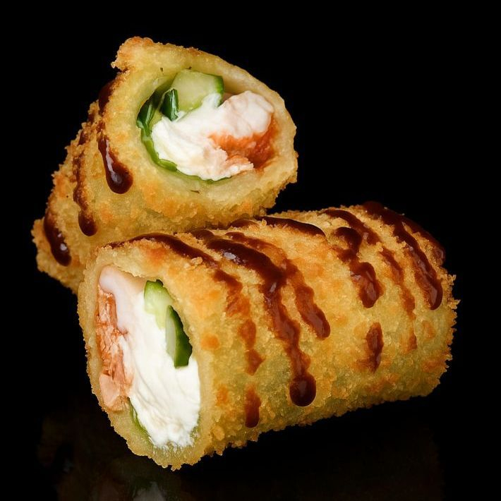 Заказать Унаги соус, лосось, огурец, салат, креветка, рисовая бумага, темпура, сыр творожный, икра массаго.
