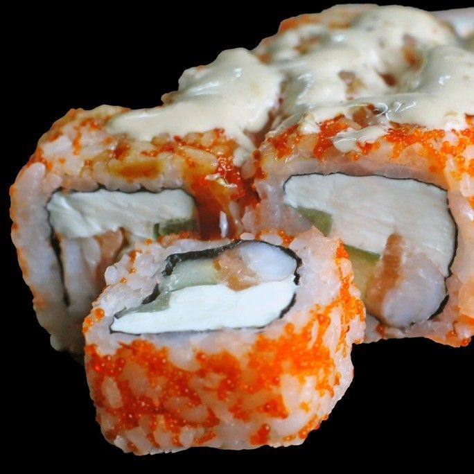 Сыр, лосось, икра масаго, огурец, салат, креветки, кунжутный соус.