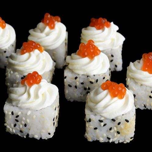 Сыр, лосось, огурец, кунжут, креветка, икра зернистая.