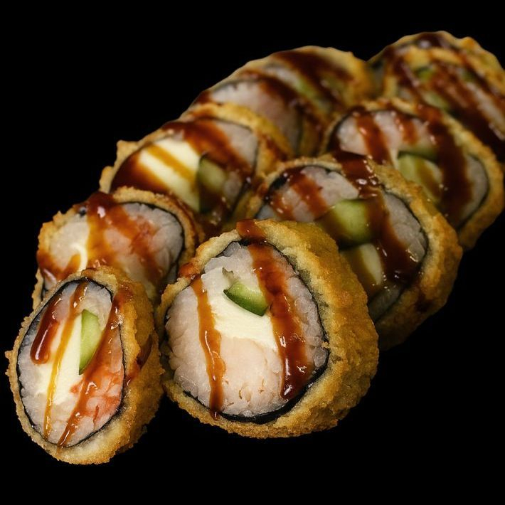 Сыр, авокадо, унаги соус, кунжут, креветка, темпура.