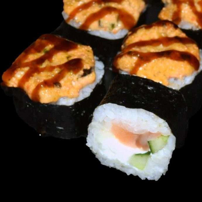 Рис, сыр, нори, лосось, огурец, спайси соус.