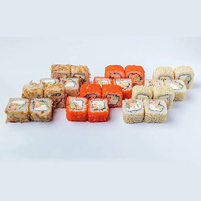 9 видов запечённых мини - роллов: с крем-крабом, 2 с кремчизом, огурцом, креветкой, мидией, ветчиной, чукой и лососем. Палочки и японский гарнир не входят в стоимость.