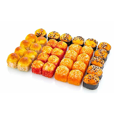 Запечённый хоно: рис, крем-краб, огурец. Запечённый эби: рис, сыр, огурец лосось, икра тобика. Запечённый татаки: рис, кунжут белый, крем-краб, кремчиз, огурец. Запечённый каван: рис, креветка, сыр, огурец.