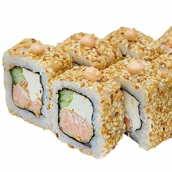 Рис, нори, кремчиз, копчёная курица, белый кунжут, соус спайси.