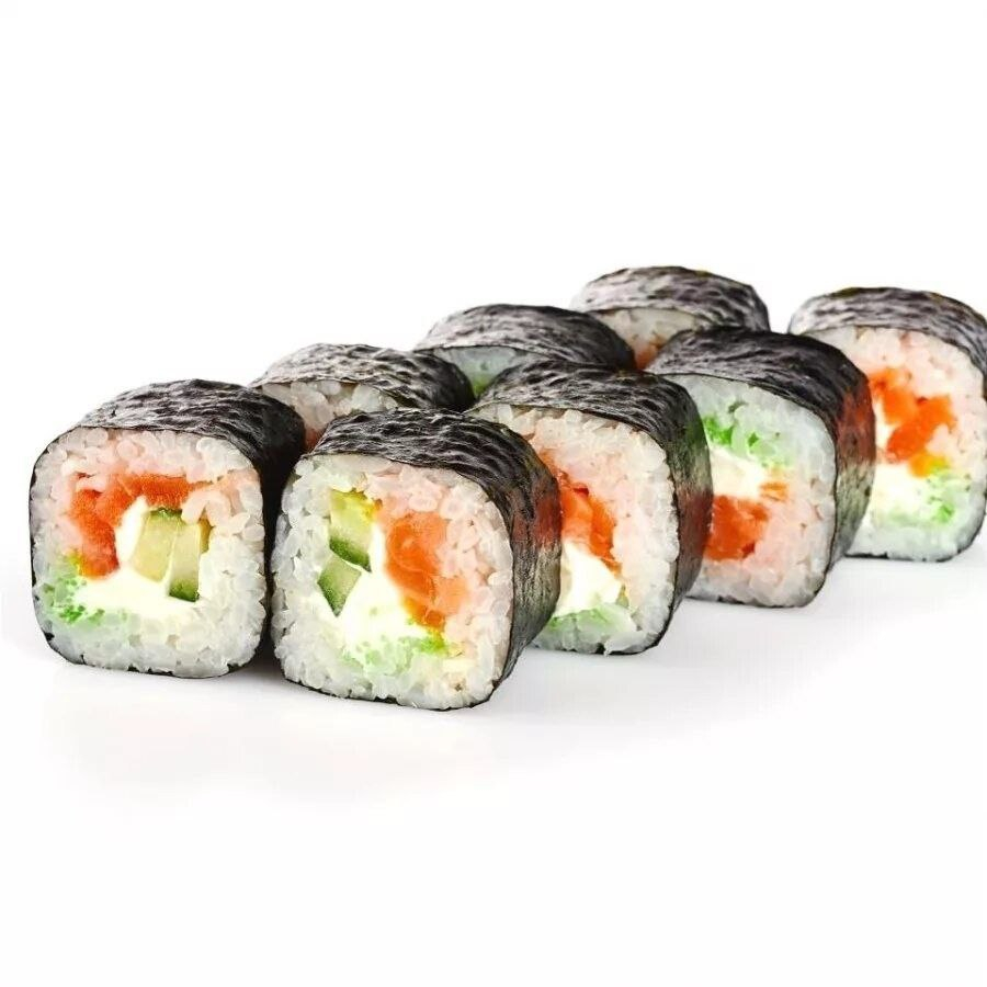 Рис, нори, огурец, лосось, тобика.