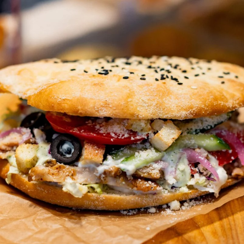Пита, микс-салат, мясо цыпленка, соус Фирменный, соус Цезарь, огурец свежий, томат свежий, маринованный красный лук, сыр пармезан, маслины, сухарики.