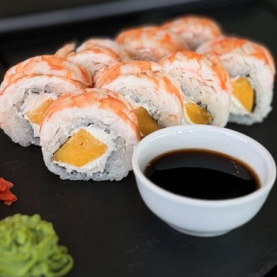 Угорь, банан, сыр, рис, нори, соус Унаги, кунжут.