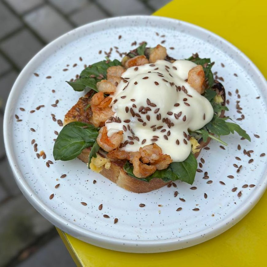 Заказать Бриошь, яйцо, руккола, шпинат, соус бенедикт, креветки.