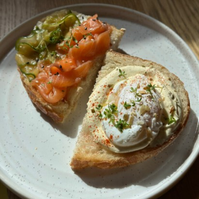 Заказать Хлеб на закваске, лосось, крем-чиз, яйцо пашот, огурец маринованный, соус голландез, пармезан, кунжут, тыквенные семечки.