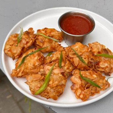 Заказать Миндальные креветки Темпура с малиновой сальсой.