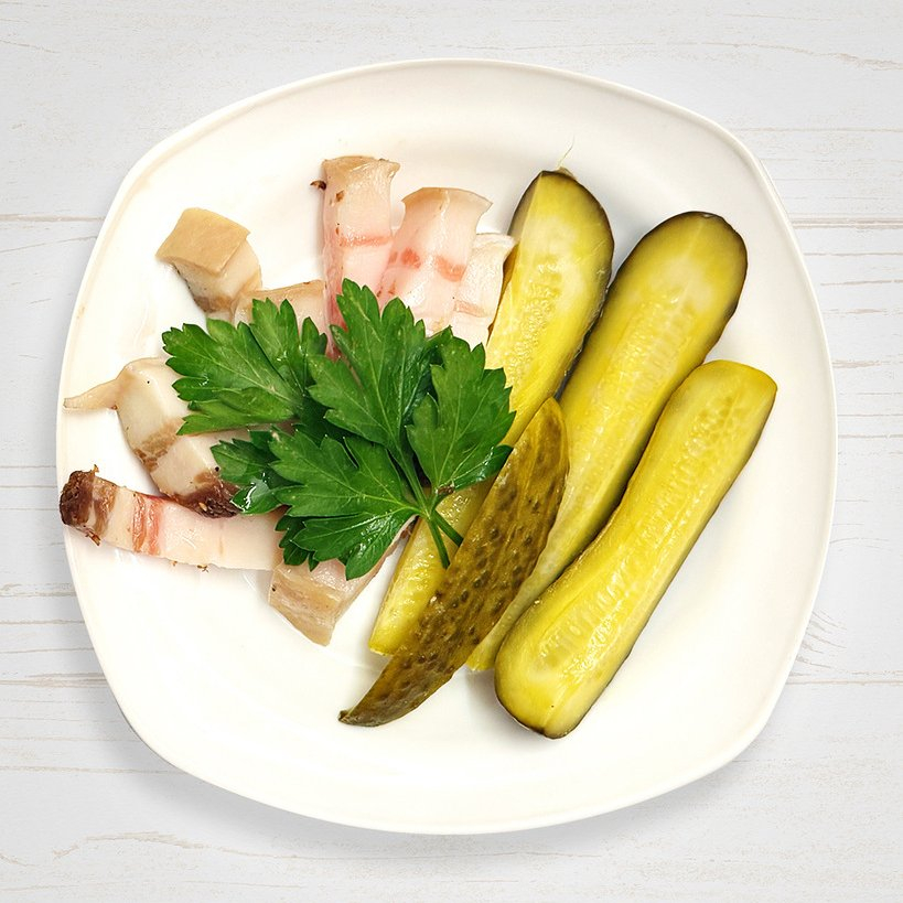 Грудинка соленая с огурцом маринованным