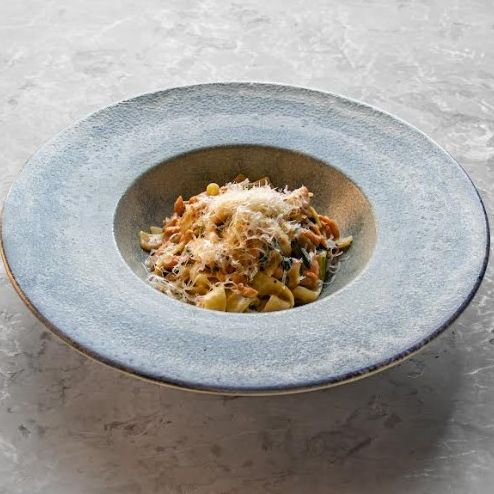 Заказать Паста фетучини, сыр с голубой плесенью, сыр твердый, сливки, томаты черри, вино белое.