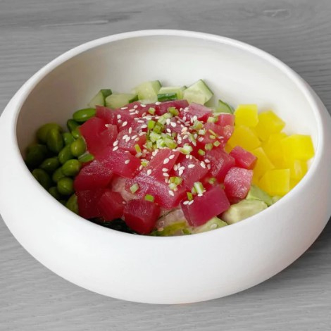 Заказать  Тунец, рис, авокадо, огурец свежий, бобы эдамаме, такуан, салат чука, огурец свежий, заправка ореховая, лук порей, заправка на основе меда, соевого соуса и сока лайма, кунжут.