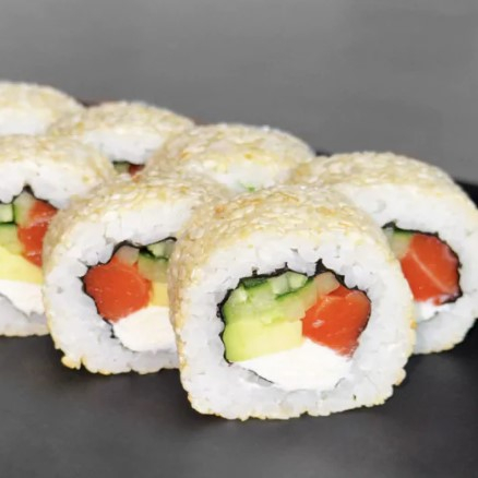 Сёмга св/м, авокадо, свежий огурец, сыр кремчиз, водоросли нори, рис, кунжут.