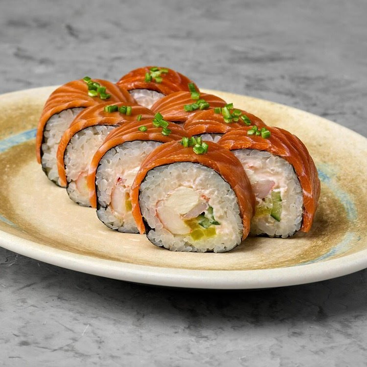 Заказать Рис, нори, креветки, лосось, такуан, огурец, сыр кремчиз, паста криль, лук порей.