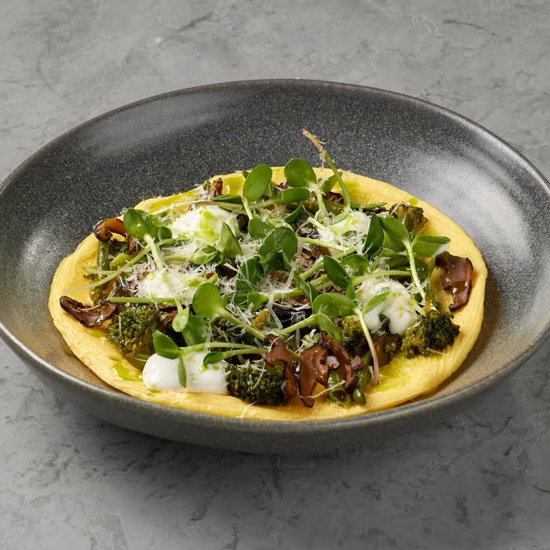 Овощной омлет с древесными грибами, пармезаном и зелёным маслом