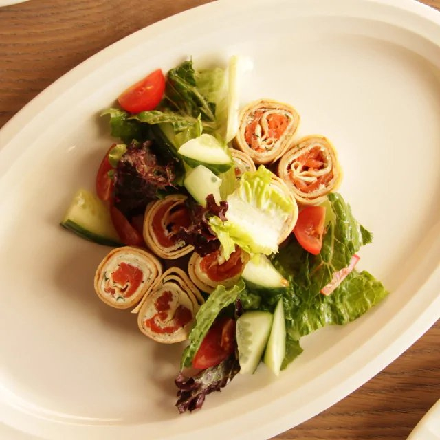 Заказать Блины, мягкий сыр, семга, огурец свежий, томат черри, микс салата, дрессинг юдзу.