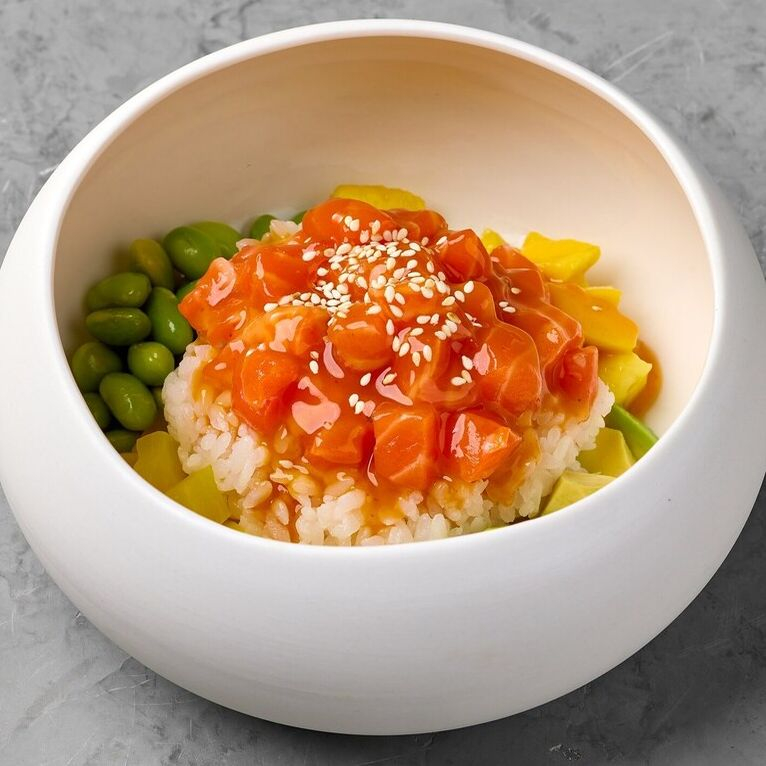 Заказать Лосось, рис, манго, бобы эдамаме, такуан, авокадо, соус манго-чили, заправка на основе меда, соевого соуса и сока лайма, кунжут.
