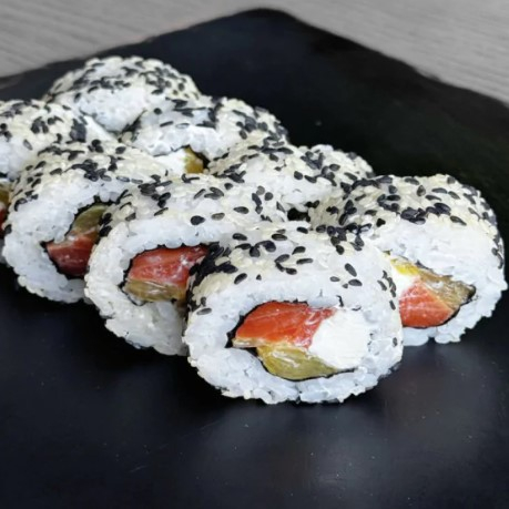 Сёмга св/м, апельсин, сыр кремчиз, водоросли нори, рис, кунжут.