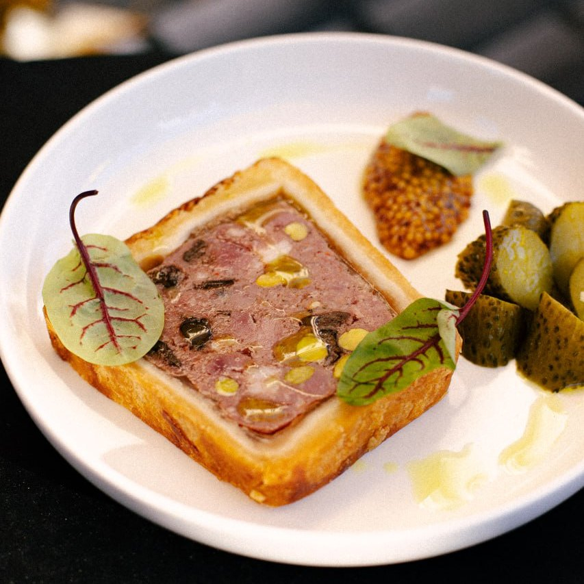 Паштет из мяса утки и бедра цыплят, с беконом, фисташками, черносливом вымоченным в хересе. Запекается в песочном тесте и желируется белым вином. Подаем со сладкой горчицей и маринованным огурцом.