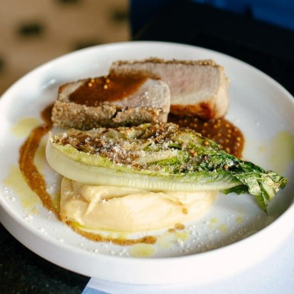 Заказать Свиная вырезка сувид с фундуком с кориандром, подаем с пюре из пастернака, соусом робэр и подпечённом на гриле романо.