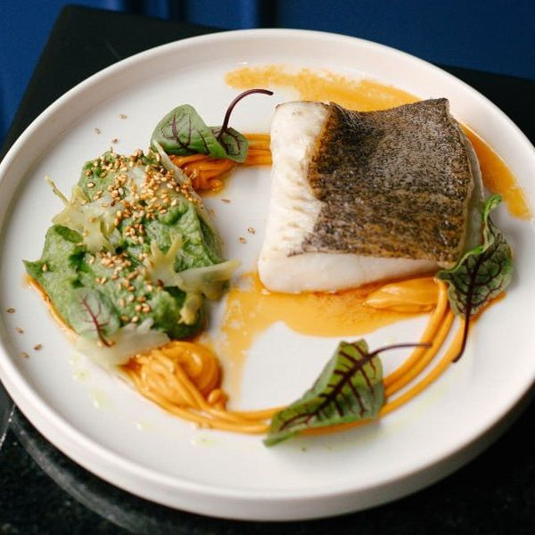Обжаренное филе палтуса, подаем с пюре из брокколи, с добавлением гороха и шпината, кунжут кимчи, соус Баффало - пикантный перечный соус на сливочном масле.
