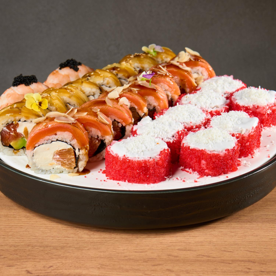 Ролл авокадо и лосось, ролл тартар с лососем темпура, запеченный ролл с креветкой, ролл Хияши.