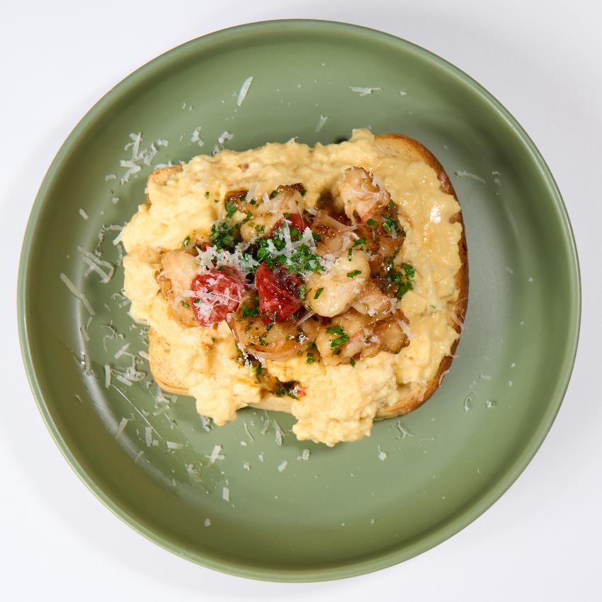 Хлеб тостовый, скрембл, томаты черри, креветки, сыр пармезан.