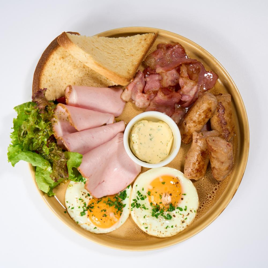 Глазунья, микс салата, бекон, колбаски, ветчина, томаты черри, хлеб тостовый, пряное масло.