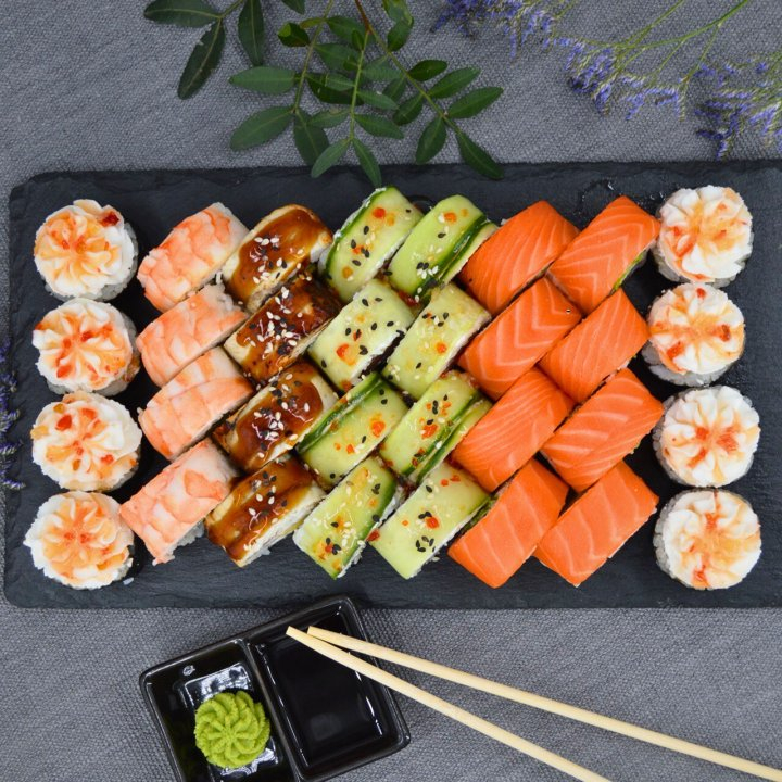 Заказать Лосось, сыр сливочный, салат Айсберг, рис, нори; Угорь, креветка Тигровая, сыр сливочный, манго, огурец, рис, нори; Тунец, томат, грибы Шитаке, сыр сливочный, огурец, рис, нори; Грибы Шитаке, омлет Томаго, такуан, сыр сливочный, соус Чили, рис, нори.