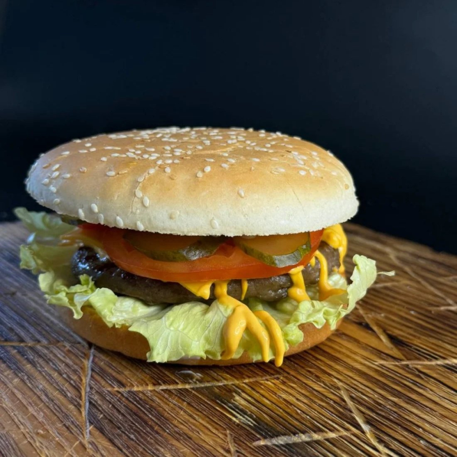 Нежное мясо говядины с листьями салата, слайсами помидора и маринованного огурца внутри вкуснейших булочек с кунжутом заправленных соусом бургер. Удовольствие в каждом кусочке!