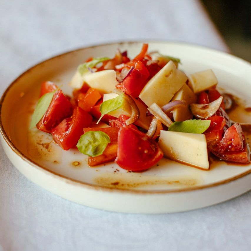 Заказать Листья салата, огурец, помидор, мягкий сыр, заправка на основе оливкового масла.