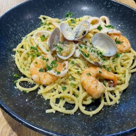 Паста, креветка королевская, вонголе, кальмар, соус биск, вино белое, оливковое масло, чили хлопья, сыр пармезан, петрушка.