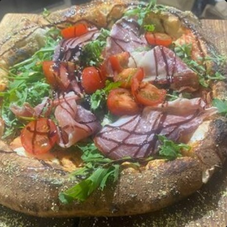 Томатная паста, томат черри, сыр моцарелла, пармская ветчина, фисташки, мёд, бальзамический крем, руккола, оливковое масло, тесто.