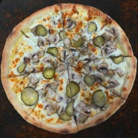 Белый соус, сыр моцарелла, цыпленок, грибы, огурец соленый, орегано.