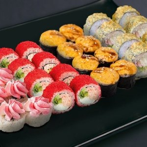 Калифорния классика, калифорния темпура, кани маки запеченный, лава с крабом.