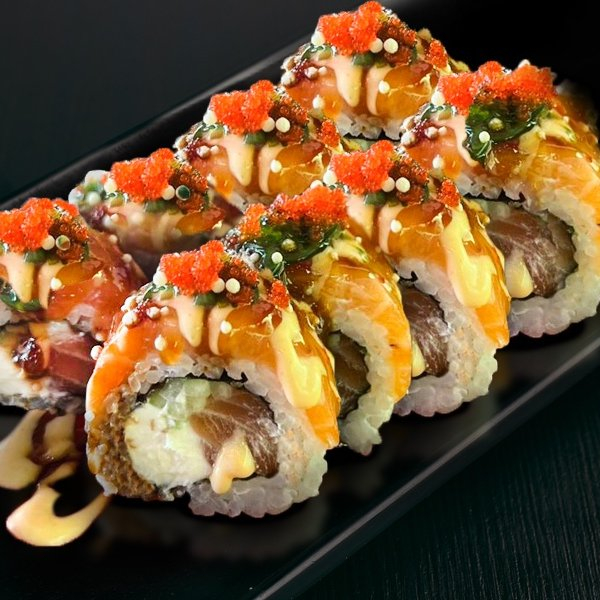 Рис, нори, сыр сливочный, огурец, лосось, чука, соус свит чили, соус спайси, унгаи соус, тобико красная, рисовые шарики.